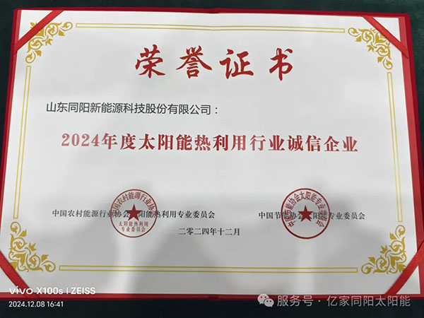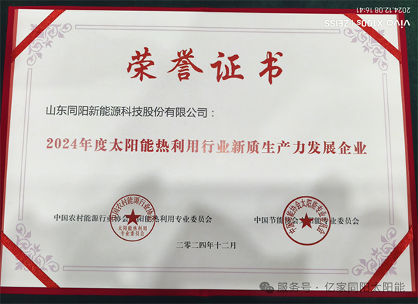 在本屆年會(huì)上,億家同陽(yáng)榮獲由中國(guó)農(nóng)村能源行業(yè)協(xié)會(huì)太陽(yáng)能熱利用專業(yè)委員會(huì)與中國(guó)節(jié)能協(xié)會(huì)太陽(yáng)能專業(yè)委員會(huì)共同頒發(fā)的“2024年度太陽(yáng)能熱利用行業(yè)誠(chéng)信單位”、“2024年度太陽(yáng)能熱利用行業(yè)新質(zhì)生產(chǎn)力發(fā)展企業(yè)”兩大榮譽(yù)稱號(hào)。