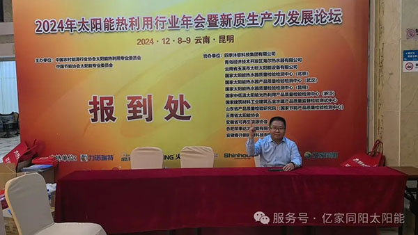 12月8-9日,山東同陽(yáng)新能源科技股份有限公司受邀參加了2024年太陽(yáng)能熱利用行業(yè)年會(huì),公司董事長(zhǎng)陳永峰、總經(jīng)理姜仁良、財(cái)務(wù)總監(jiān)張瑞娟出席。在會(huì)上,姜總以“扎根行業(yè) 服務(wù)行業(yè)”做主題演講,強(qiáng)調(diào)了億家同陽(yáng)將以全心全意為客戶和行業(yè)服務(wù)的理念發(fā)展下去。與此同時(shí),億家同陽(yáng)借行業(yè)年會(huì)之機(jī),傳承這份陽(yáng)光之志,與行業(yè)同仁再敘陽(yáng)光之情!