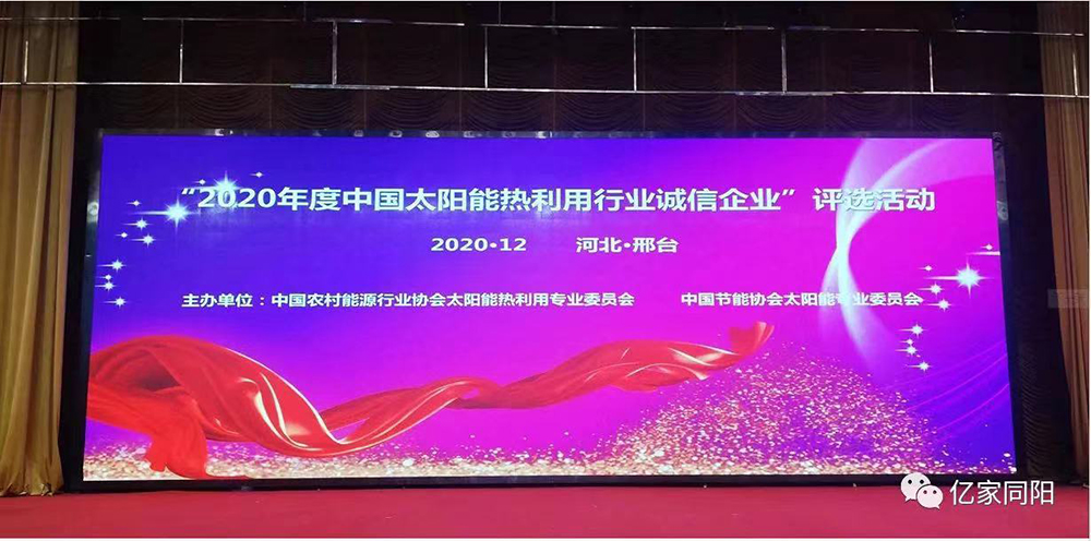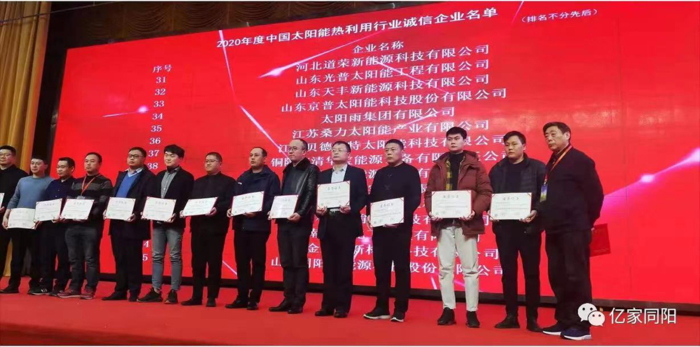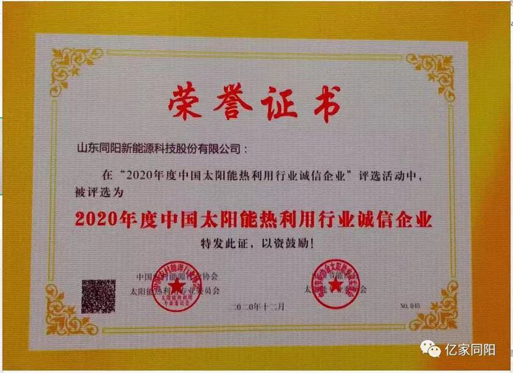 山東同陽新能源科技股份有限公司始終將“以誠取勝”作為企業(yè)生存之本,憑借強烈的誠信意識,弘揚誠實守信風尚、推動行業(yè)誠信體系建設,再次榮獲“2020年度中國太陽能熱利用行業(yè)誠信企業(yè)”稱號。