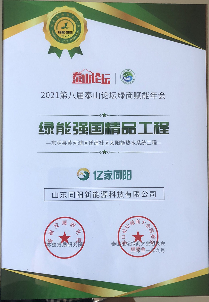 商道啟人生,夢想創(chuàng)財富。一年一度的泰山論壇綠商年會,早已成為清潔能源行業(yè)中新產(chǎn)品、新技術(shù)的展示平臺,是太陽能、空氣能等清潔能源品牌的一場饕餮盛宴。其中,作為泰山論壇重要環(huán)節(jié)的頒獎盛典,其蘊含的分量之重,含金量之高,每一屆都受到全國各地的清潔能源大咖和綠商精英的深切關(guān)注。頒獎盛典不僅回顧了清潔能源創(chuàng)業(yè)者帶給社會的感動與堅守,也為推進綠能強國提供了創(chuàng)業(yè)投資、廠商對接等面對面溝通機會。在9月10日的頒獎盛典上,多項清潔能源行業(yè)大獎決出,以致敬清潔能源領(lǐng)域涌現(xiàn)出的優(yōu)秀品牌和行業(yè)英雄。其中,億家同陽憑借著一流的產(chǎn)品品質(zhì)和雄厚的企業(yè)實力,億家同陽一舉拿下“綠能強國精品工程”和“年度新銳人物”兩項大獎榮譽!